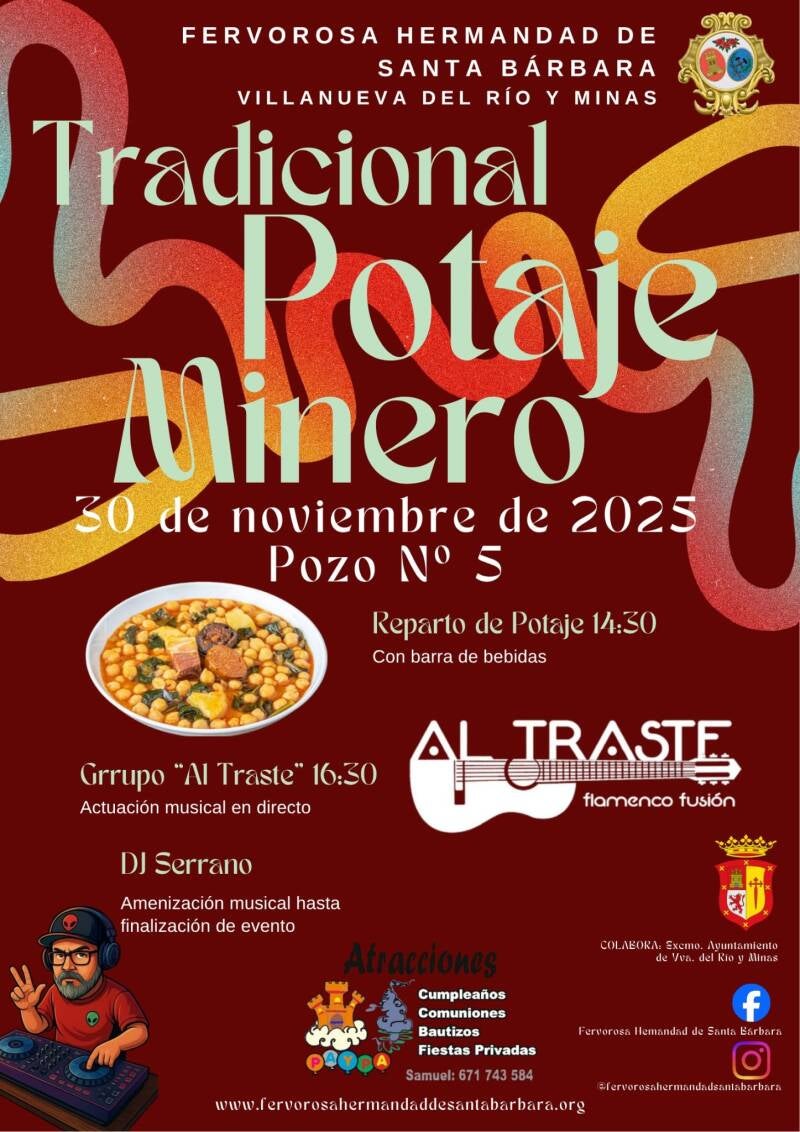 En el marco de estos cultos, la Hermandad convoca asimismo a todos los hermanos, devotos y a todo el pueblo de Villanueva del Río y Minas a nuestra tradicional jornada de convivencia con motivo del Potaje Minero, que tendrá lugar el 30 de noviembre de 2025 en el Pozo nº 5.